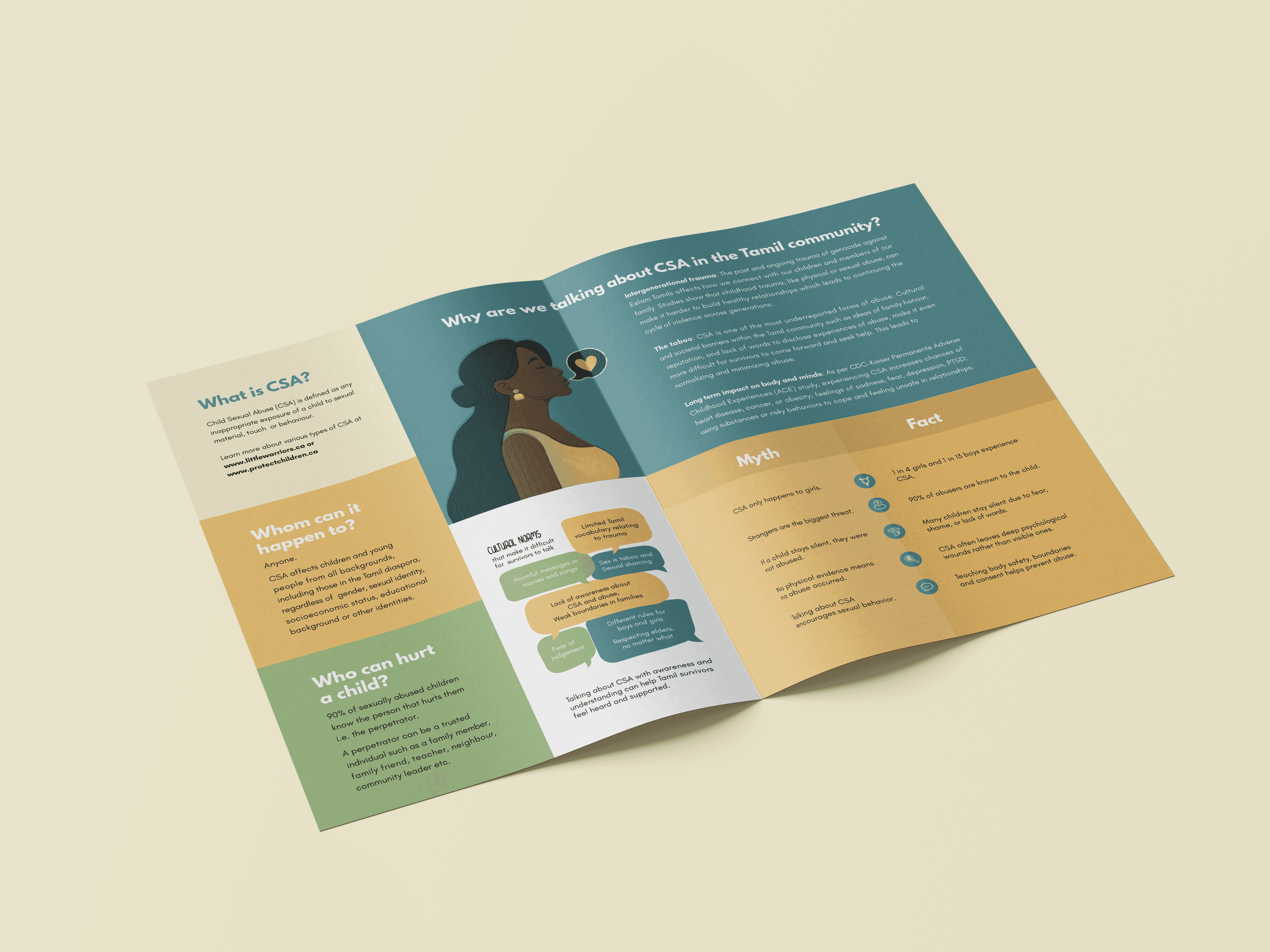 A.N.B.U. needed a brochure that could reach Tamil community members on one of the most difficult topics imaginable. The design had to feel warm and approachable without minimising the seriousness of the subject. Custom illustrations were created to represent the community with care and cultural sensitivity, paired with a layout that guided readers gently through heavy content. Every colour, character, and composition was chosen to make survivors feel seen rather than overwhelmed.